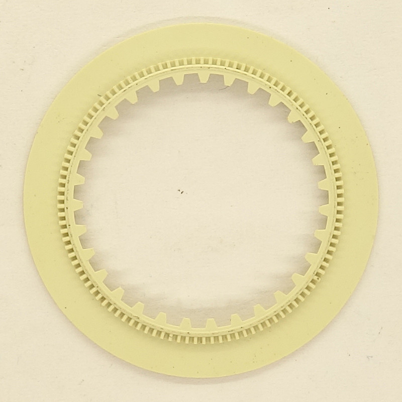 The date ring is unfortunately made of plastic and so prone to break (plastic becomes brittle after the 50 years, this movement is already old). It has got on its outer rim a tooth ring, which is used for the quickset funktion - in both directions!