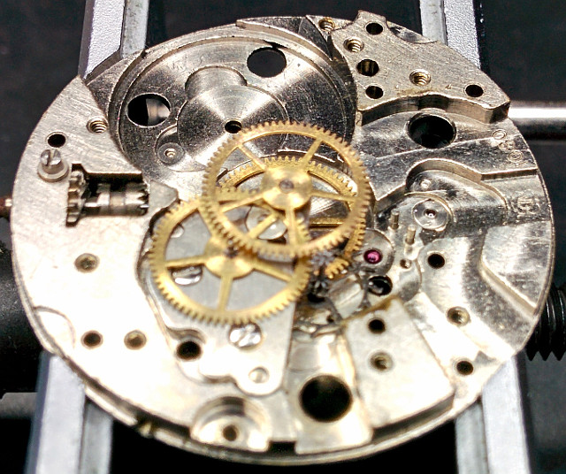 In the fifties, it was common, that the minute wheel was directly driven by the mainspring and located under an own cock. The upper jewel bearing is also used for the center second hand, which is also directly driven.