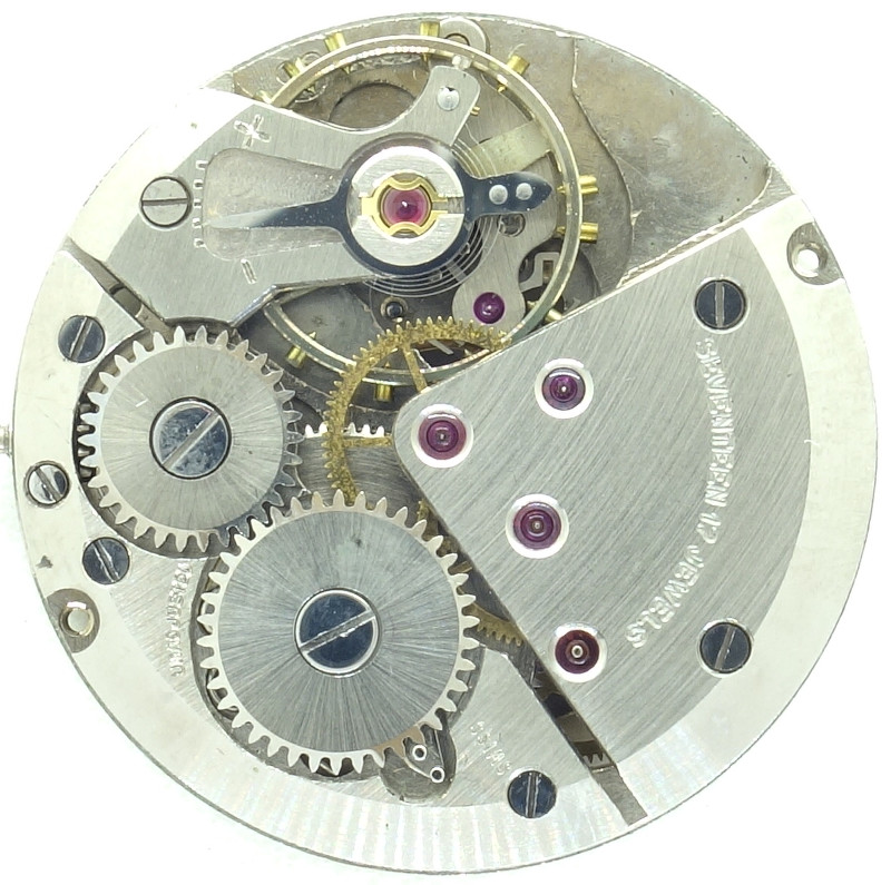 In 1954, the swiss ETA launched a completely new and modern constructed series of windup and selfwinding movements, whose base caliber is the ETA 2390 with a diameter of 10 1/2 lignes. For the first time, its gear train lacks the center minute wheel to reduce the clearance of the minute hands, which was caused by the low-numbered toothing of a central minute wheel. This mechanism, called “System ETA”, invented by Heinrich Stamm was also patented under the swiss patent number CH297900A.