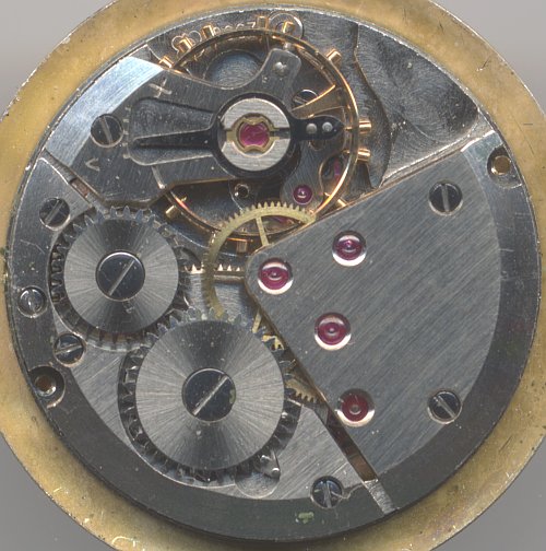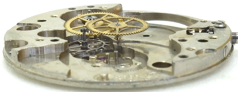 The base plate not only shows the good quality of the movement - all important bearings use rubies, but also that the gear train was constructed in a very modern way with the lack of a directly driven center minute wheel.