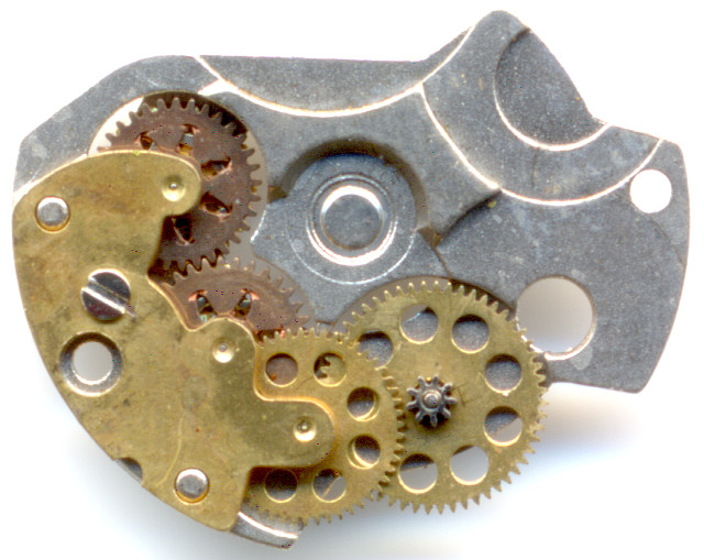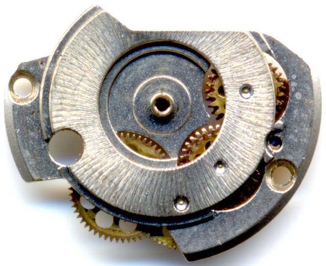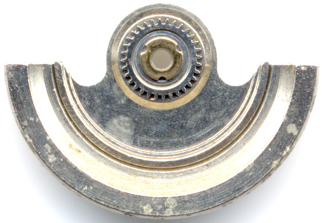 The selfwinding gear train consists of four gears: Two change wheels (with pawls), which engage with the oscillating weight, and two reducer wheels.