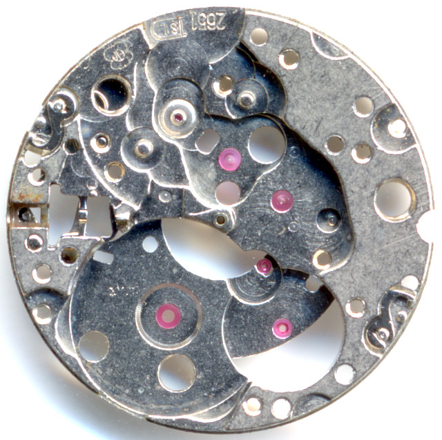 As on all better movements, all important bearing contain synthetic rubies, except for the bearing of the center second. Additionally, the mainspring barrel is ruby-beared on the dial side.