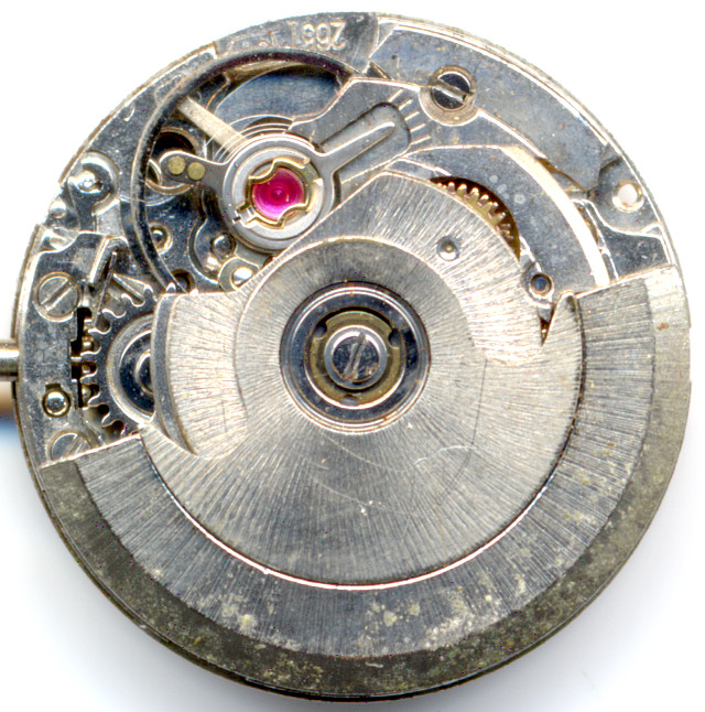 On this ETA 2651 specimen, the oscillating weight in axle-beared, but there also exist versions with a ball bearing.