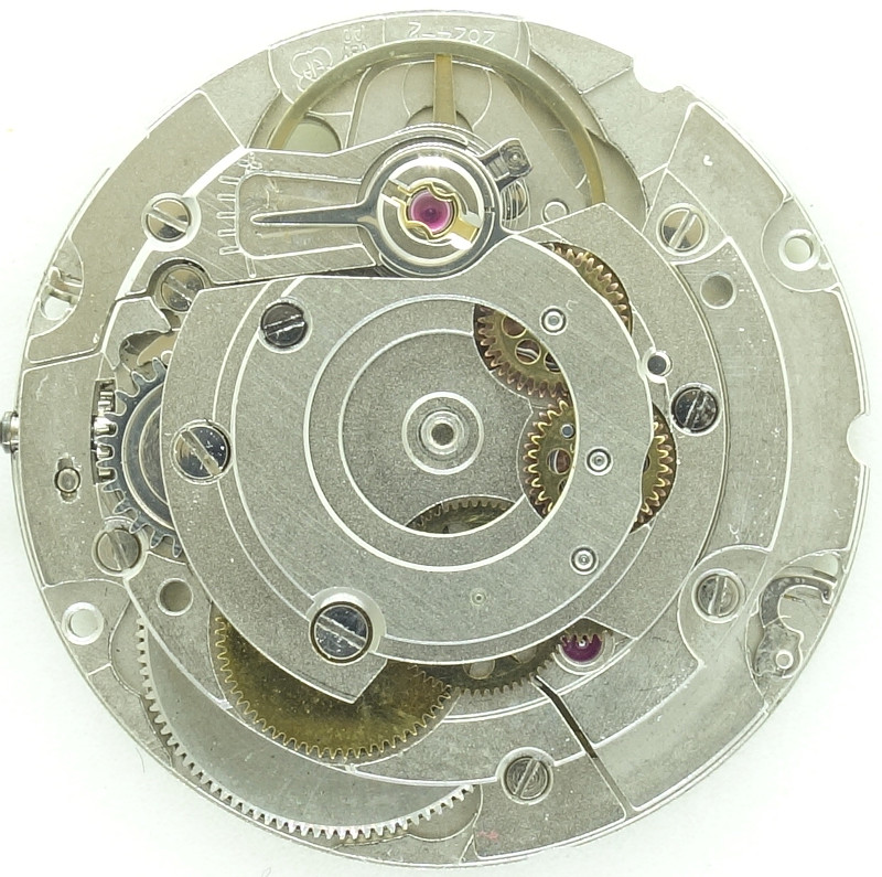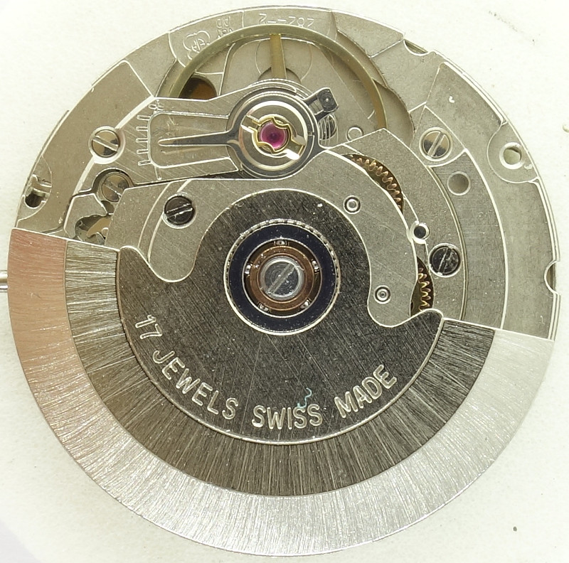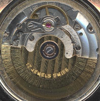 The four bearings of the selfwinding module of the 25 jewels version contain rubies on each side, those of the 17 jewels version shown here, only simple metal bearings.