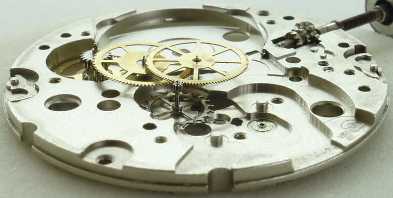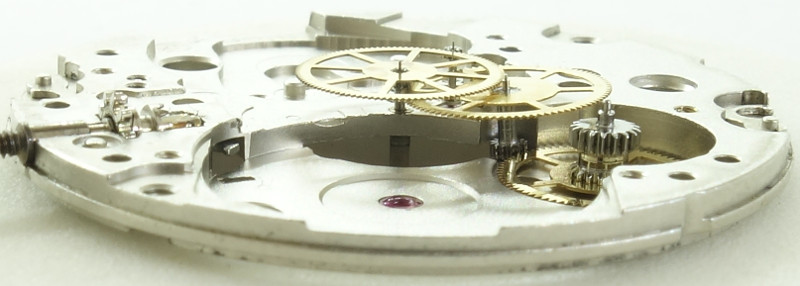 On the empty dial side, you can see at 7 o’clock the second and third wheel, where the latter one engages with the minute wheel on the dial side.