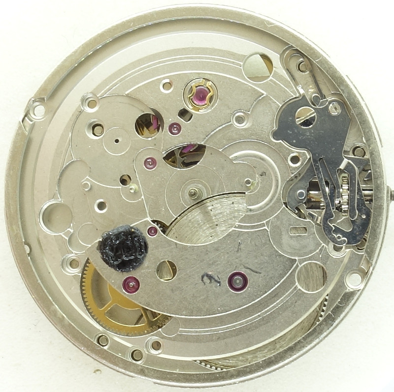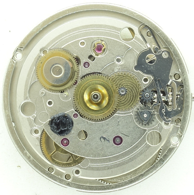 The base plate not only shows, that all important bearings (except of the center second hand) contain rubies, it also shows, that we have a gear train with indirectly driven hands on the dial side - a modern construction, introduced mainly by ETA in the early 1950s.