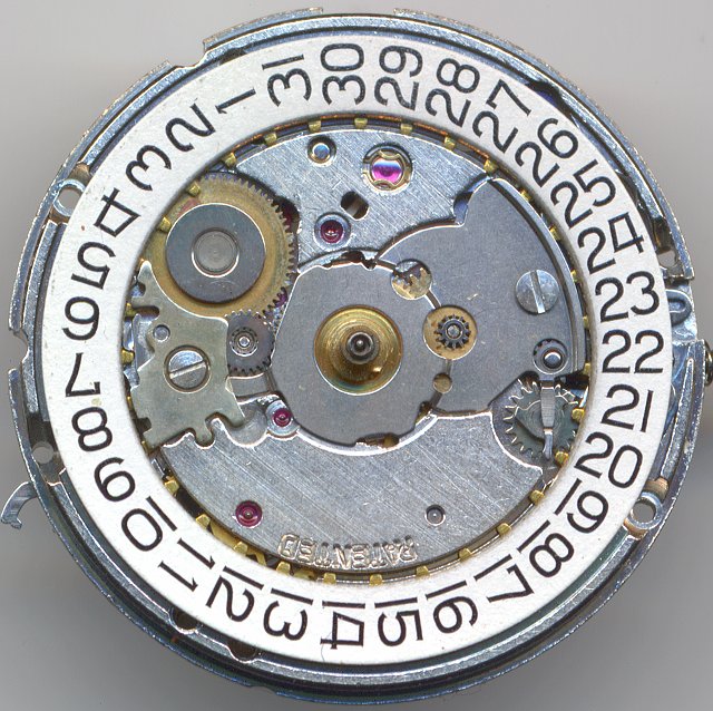 The date mechanism advances the date instantly and allows manual correction on the second (of three) crown positions. The driving wheel is even jewel-beared!
