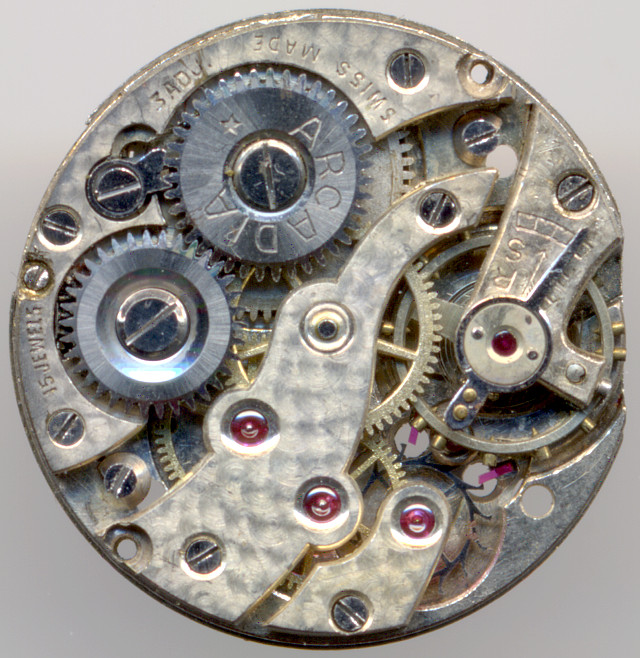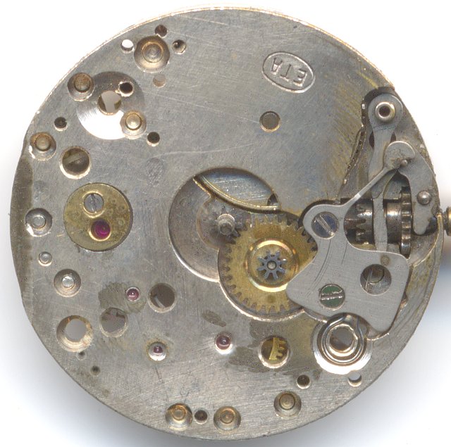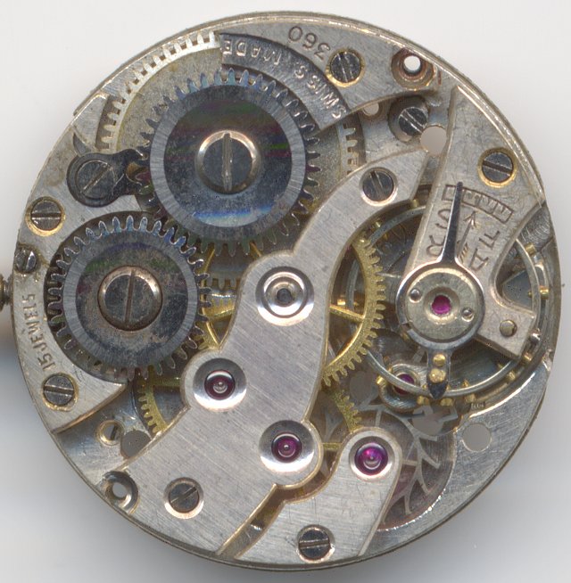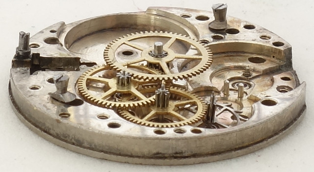 Unlike modern movements, the escapement wheel, which is located deeply in the main plate, has also got an own cock; the other gears, fourth, third and second wheel are located under an own bridge and are partially beared in synthetic rubis. Their total number is 15, which was the maximum at that time.