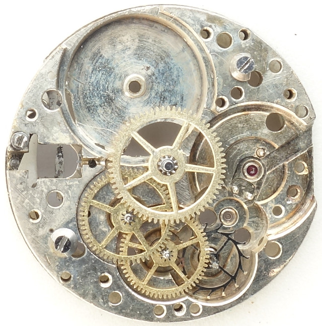 The base place shows very well the bordered bearing jewels, which are colored differently. Center minute wheel and mainspring barrel don’t have ruby bearings, but that was standard then.