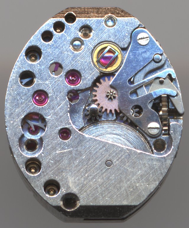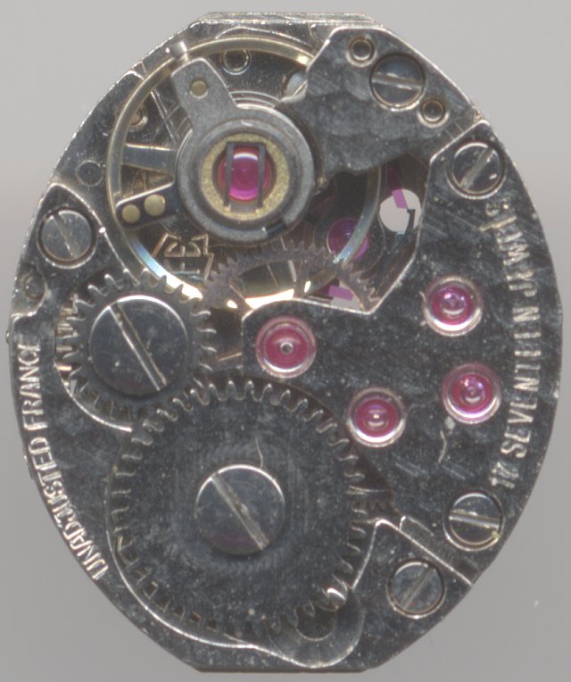 This ladies’ watch movement of France Ebauches is unfortunately not stamped with a caliber number. It reminds strongly of the caliber 68, but differs in some details, especially on the winding mechanism on the dial side.