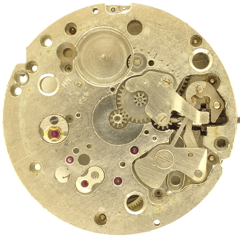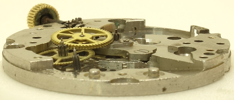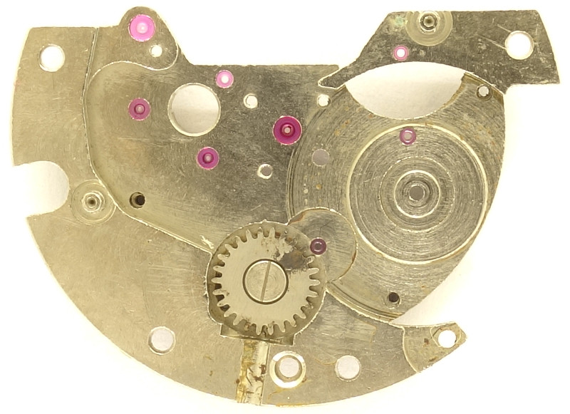 Das zentrale Minutenrad war Anfang der 60er Jahre, als dieses Werk auf den Markt kam, durchaus noch Stand der Technik, und die große Grundplatine erlaubte trotzdem ein sehr groß dimensioniertes Federhaus.