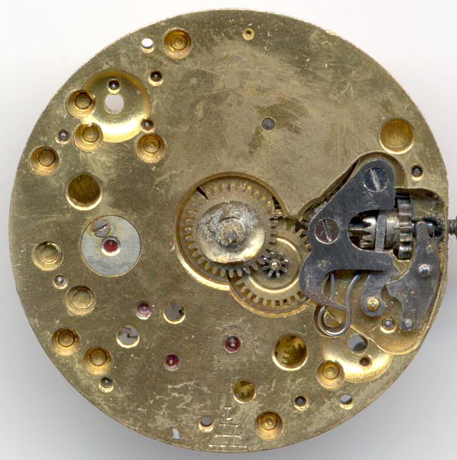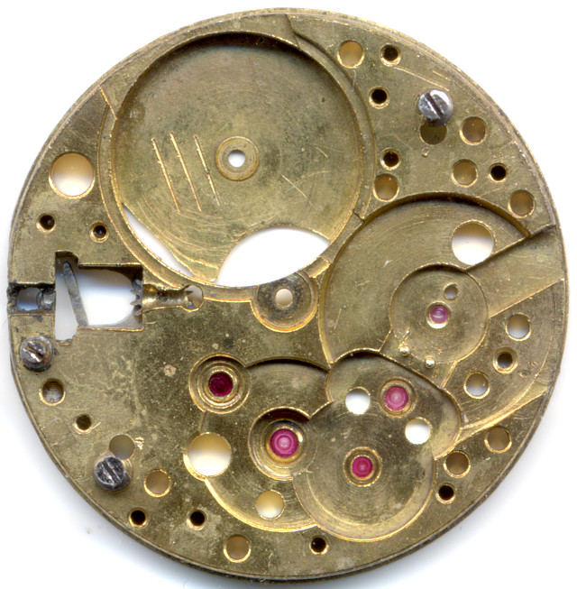 All important bearings contain synthetic rubies, in total uses this movement 15 jewels, the maximum of that time.
