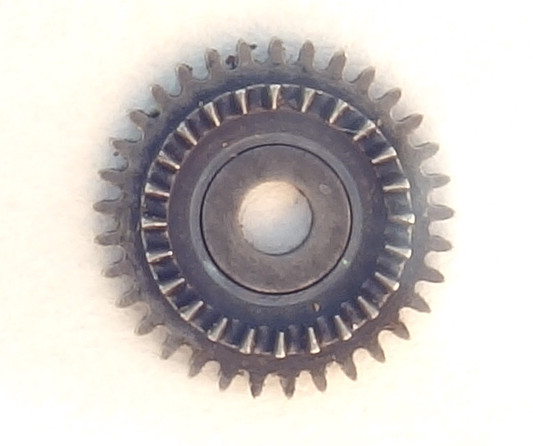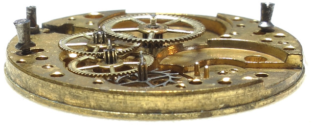 A little oddity on this movement is the crown wheel, which has got two gearings, the normal outer sprocket and a gearings on its lower side, which is connected with the winding pinion.