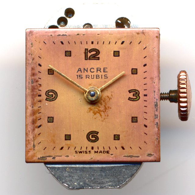 On the dial side, you can spot the age of this movement, which was launched in the late 1940ies: At the bottom, there’s an engraved minute dial, which helps the watchmaker on regulating the device. And, as sometimes seen on old movement, the escapement pallets are made of transparent material (but of which one exactly?) - at position “10”, you can spot them.