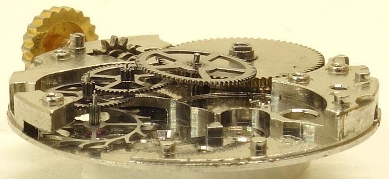 The gear train with its all silver colored gears is very classical: The mainspring barrel drives the center minute wheel, followed by third wheel, fourth wheel and escape wheel.