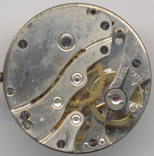 The non-shock protected balance is beared in four jewels, the cylinder escapement wheel in two and the rest of the gears runs in metal bearings.