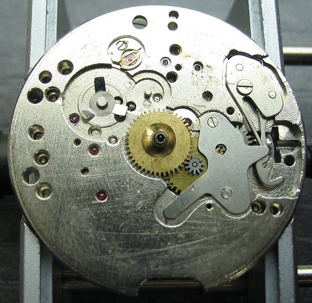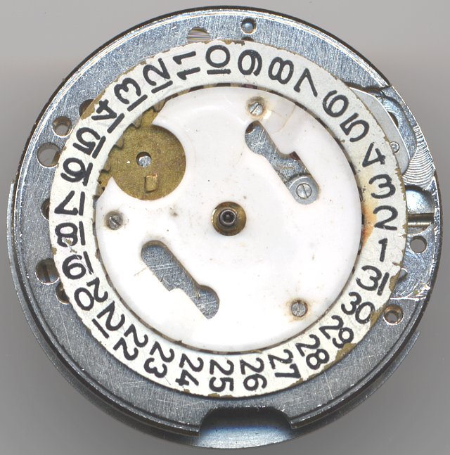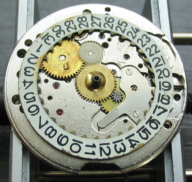 The date mechanism is below a plastic bearing plate. This is an unfortunate solution, since the plastic ages and get loose, as you can see on the photos at the regions of the screws.