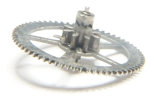 The gear train consists of a center minute wheel, followed by the third wheel, center seconds wheel and finally the escape wheel.
