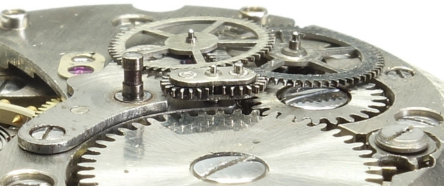 When the oscillating weight is missing, you can spot the clutch at 6 o’clock, which takes care, that the two reduction wheels never turn back.