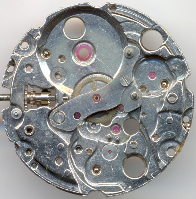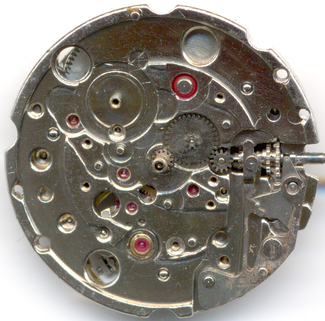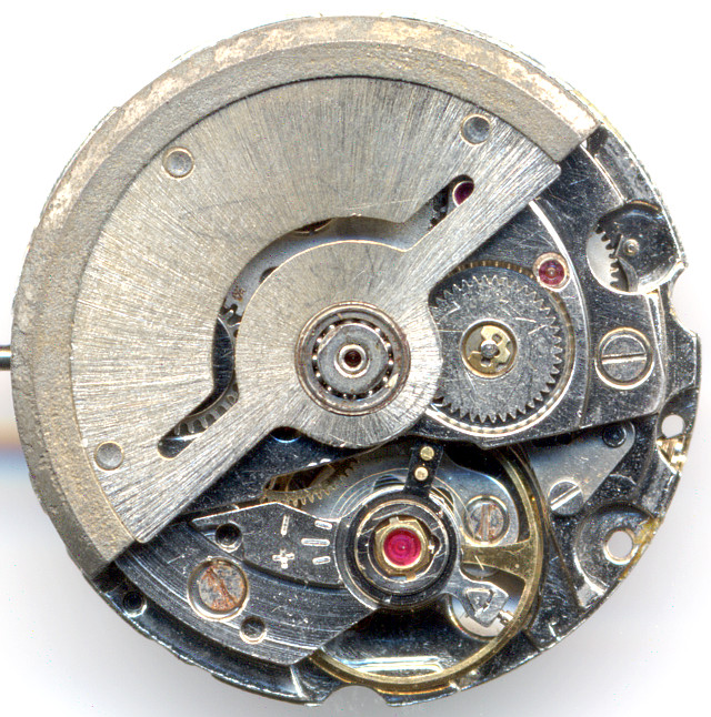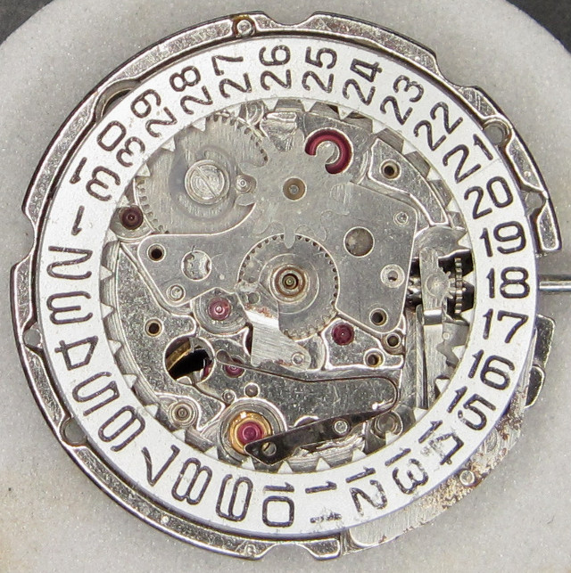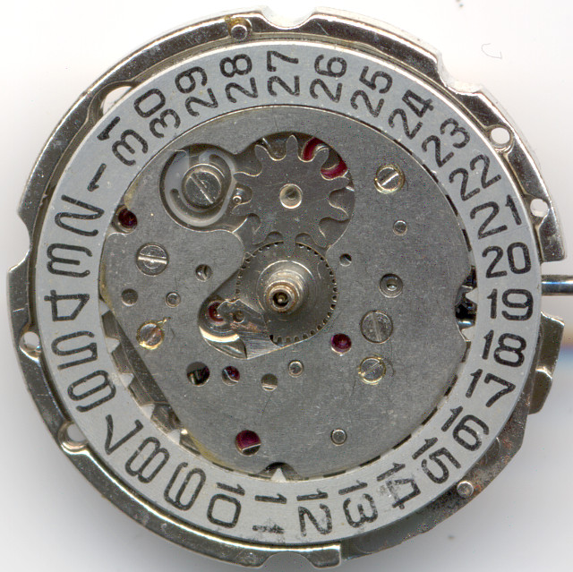 The date indication mechanism has got a driving wheel with a plastic finger to ensure, that the date ring only advances but never turns back. This is important, as this is the only way to adjust day and date, since the day disc can be turned back and forth.