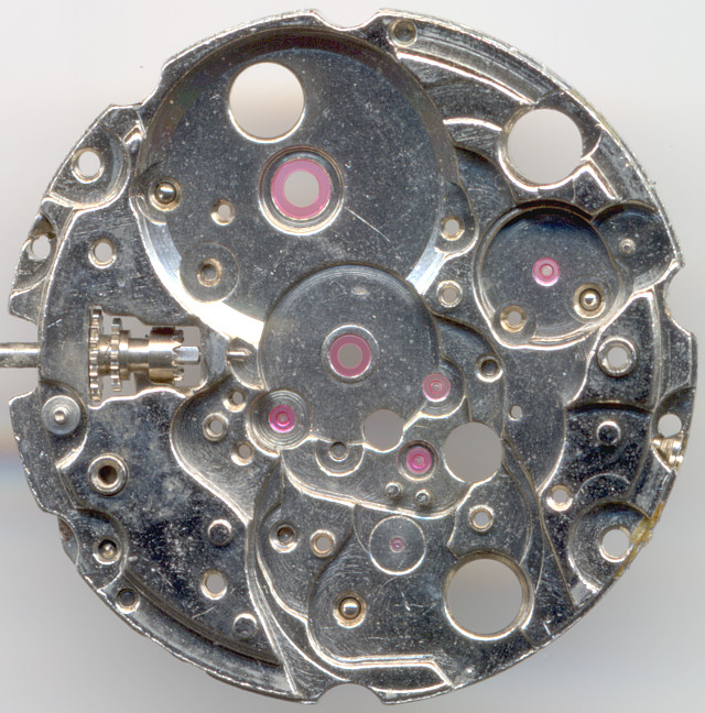 On the base plate you see, that all bearings, including those of the minute wheel and mainspring barrel are equipped with rubies. Perfect!