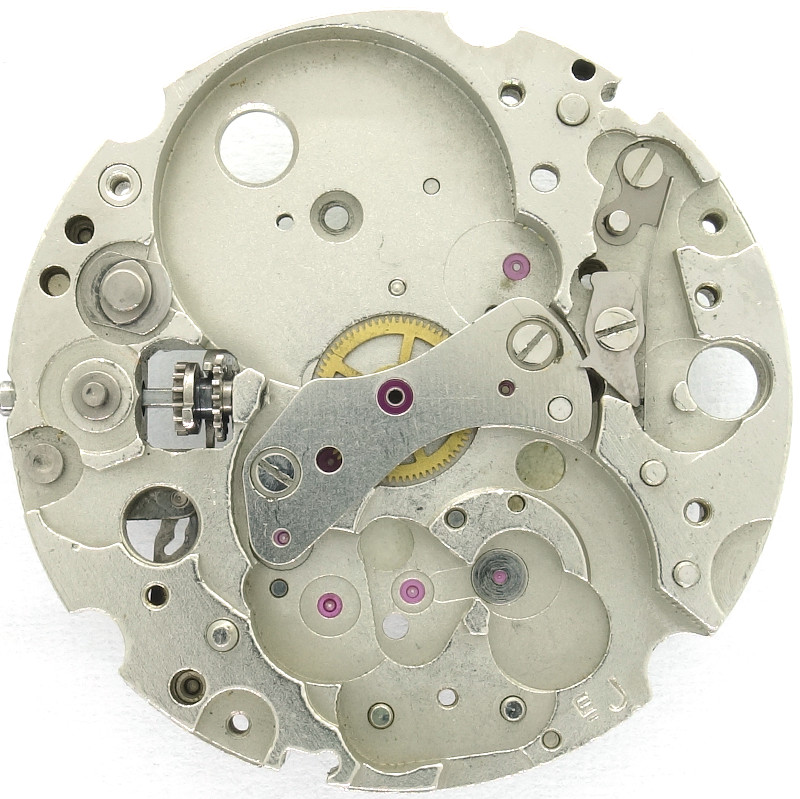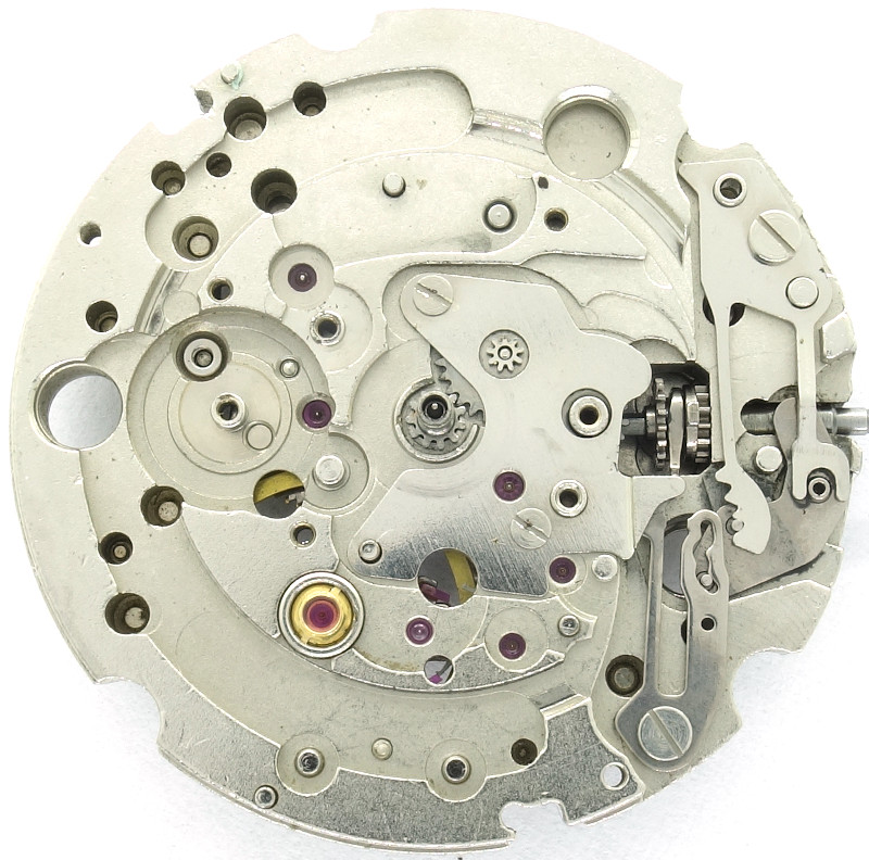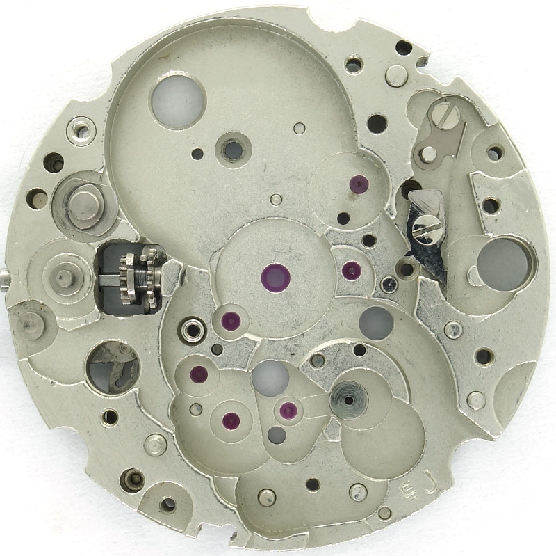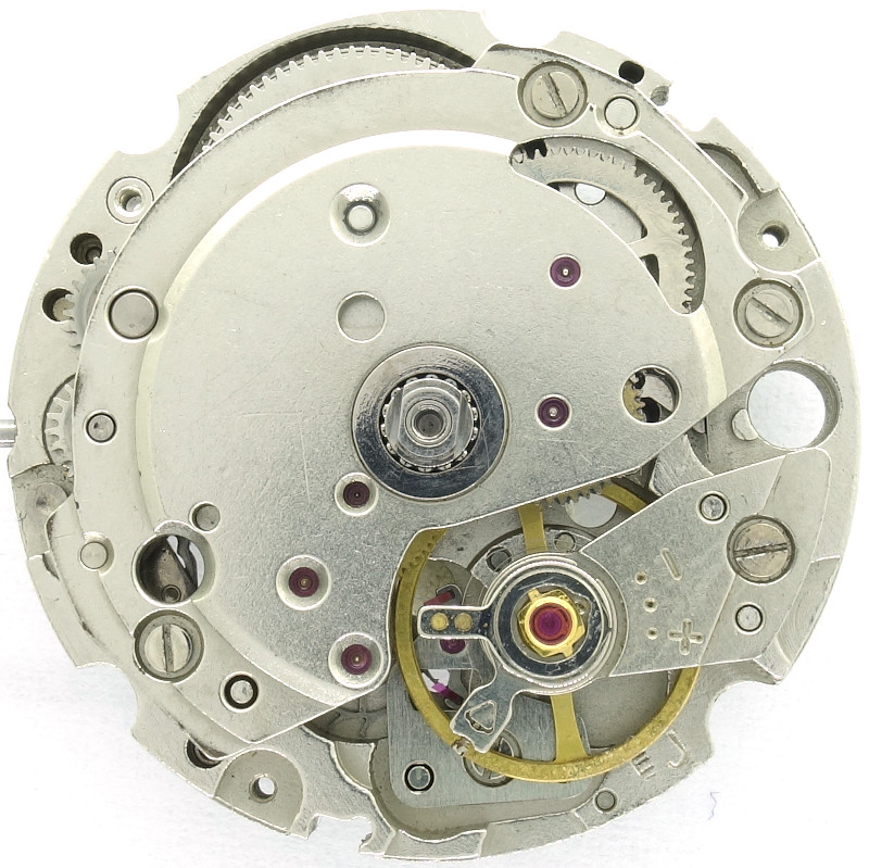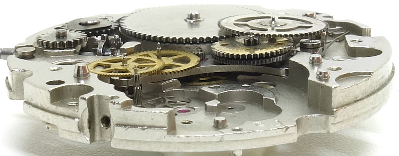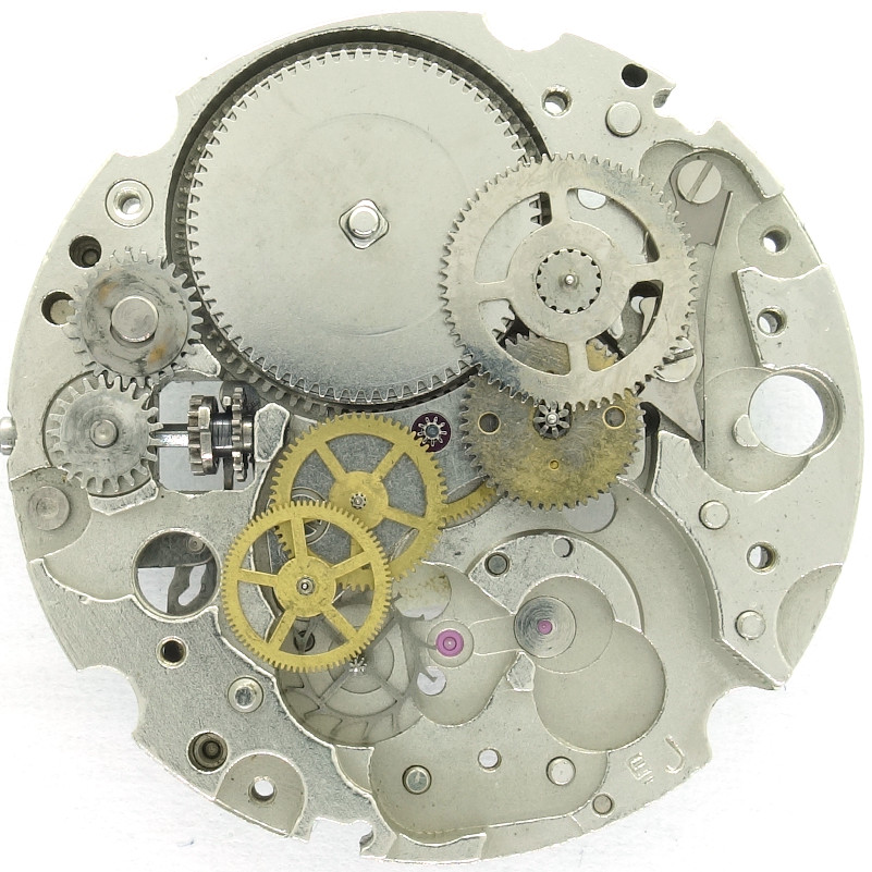 The 1970s construction uses a directly driven (by the mainspring barrel) center minute wheel, which is beared under its own bridge.