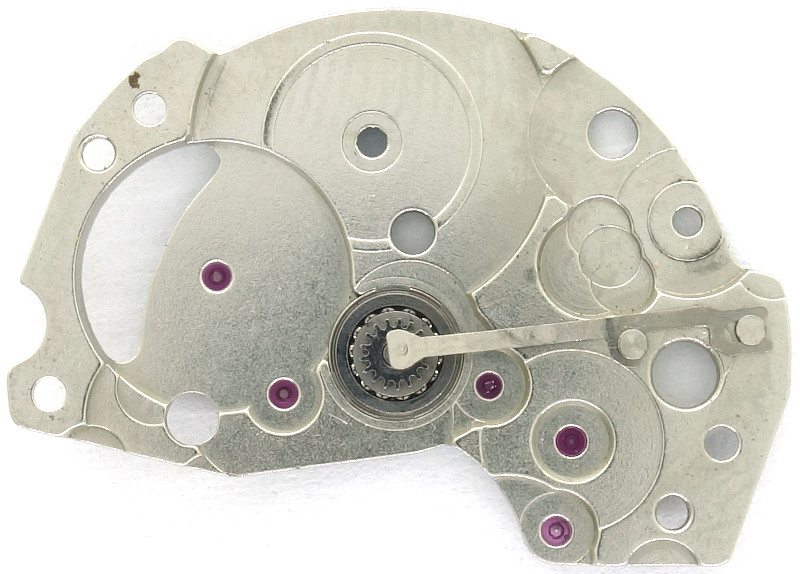 For the time works, there are the mainspring barrel, center minute wheel, the third wheel, the seconds wheel and the center seconds pinion simultaneously and finally the escape wheel.