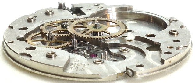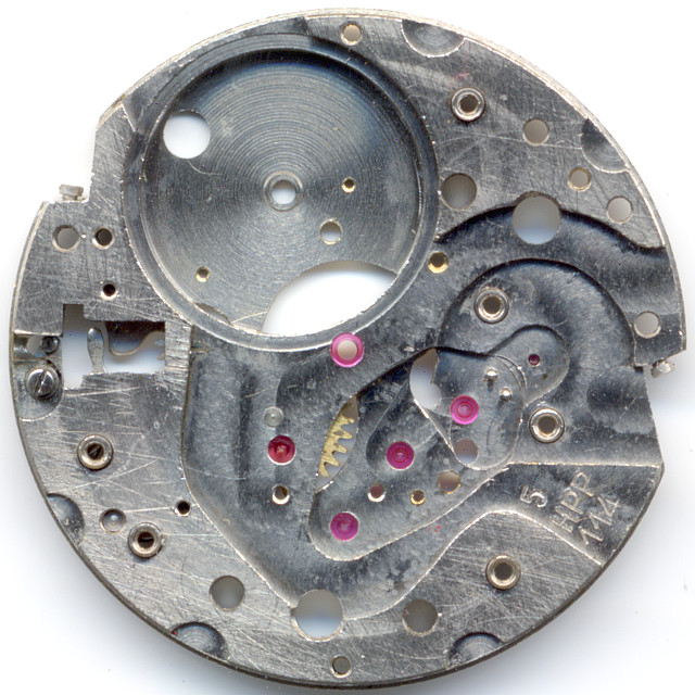 The HPP 114 uses 17 jewels, and since the minute wheel is ruby beared on both sides, too, there were no cap jewels required to achieve the “magical” number of 17 jewels.