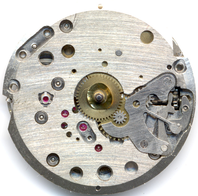Since this movement has got no calendar mechanism, the dial side looks pretty simple. At 3 o’clock you can see the yoke winding system with the large setting lever spring, which covers the change wheel largely.