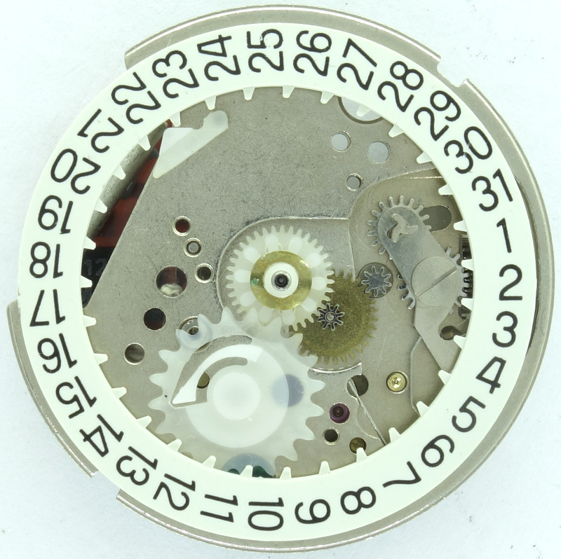 The calendar mechanism uses plastic parts everywhere, for the hour wheel, the switching wheel and the detent lever.