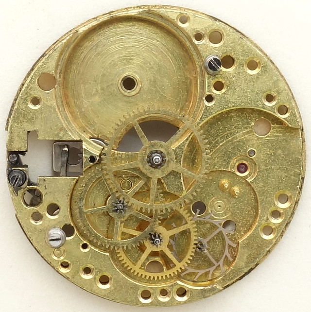 The gear train construction is typical for the time being: The mainspring barrel drives the center minute wheel, followed by third wheel, seconds wheel at 6 o’clock and steel escape wheel.