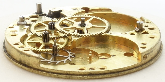 The yellow burnt base plate gives a throwback to the 1930ies. At that time, it was usual, that cheaper movement had only a few or even no bearing jewels. The Junghans J80 in the version shown here makes no exception, only the balance wheel is ruby beared, the others run in brass bearings.