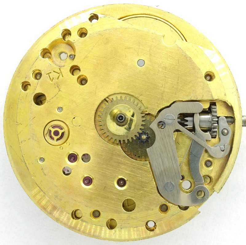 The gear train of this pretty large 28mm (12 1/2 or 12 lignes, according to literatore) windup movement is classical: The mainspring barrel drives the center minute wheel, followed by third wheel, seconds wheel at position 6 o’clock and escape wheel.