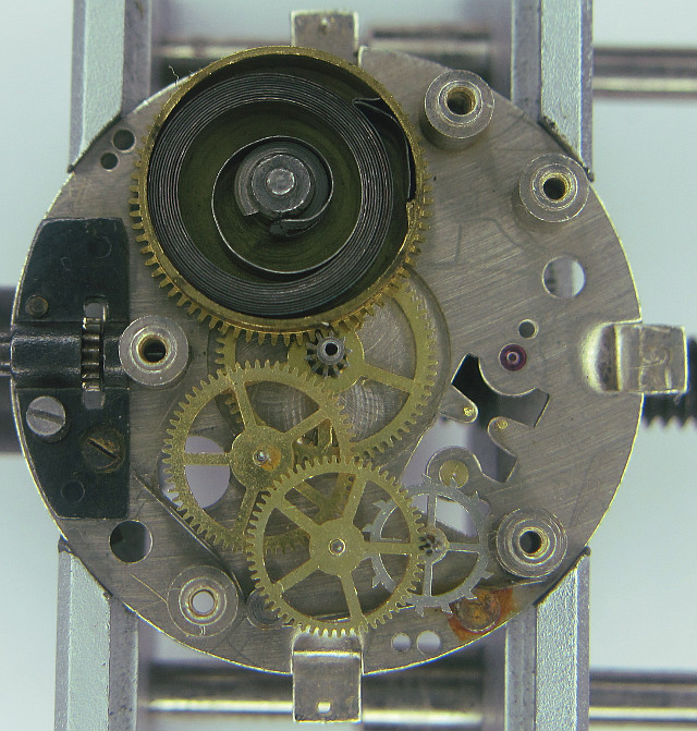 The movement was pretty raw and undecorated. The bearings were just made of brass and didn’t contain jewels, except the balance, which was beared in two pairs of jewels. The fifth jewel was the upper bearing of the central second gear.