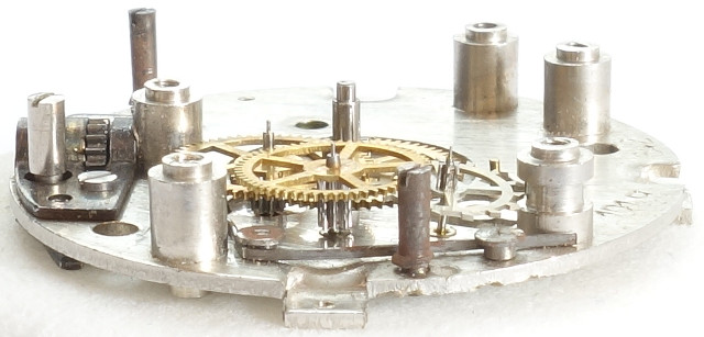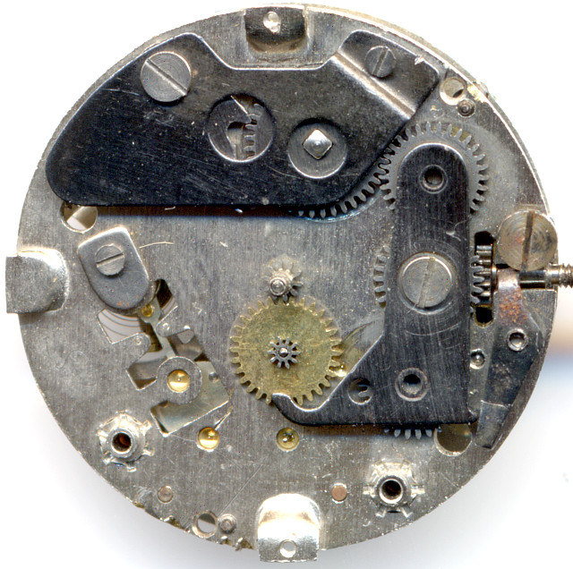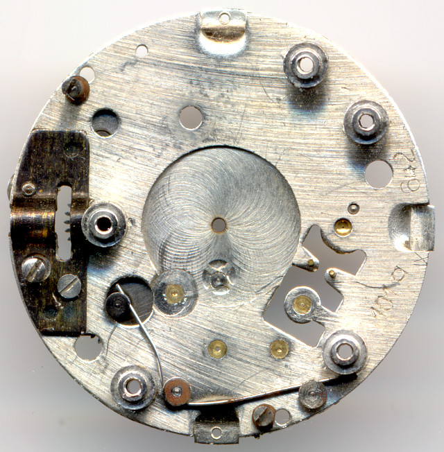The jewel-less base plate of the K9 shown here has got four flaps in 90° angel, with two of them contain bearings for the dial screws. Compared to the K48, the flaps are less overhanging.