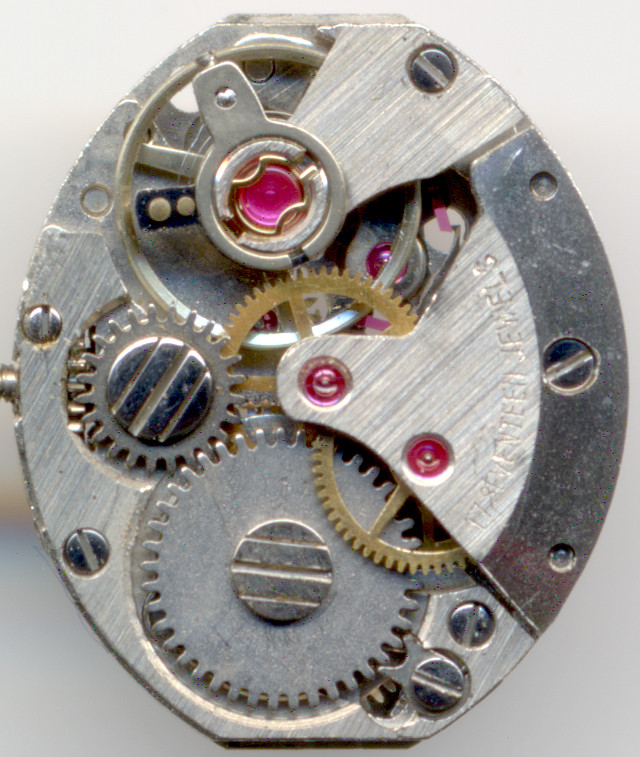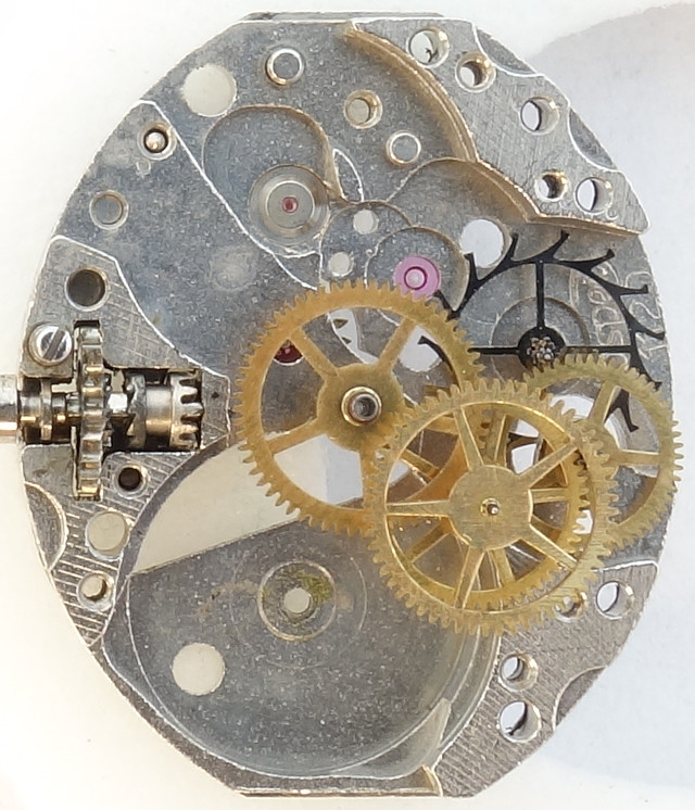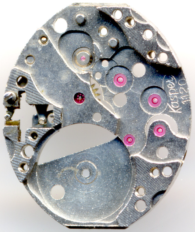 Escape wheel, seconds whee and minute wheel are beared below the lower gear train bridge, the minute wheel has got a ruby bearing only here and not on the dial side.