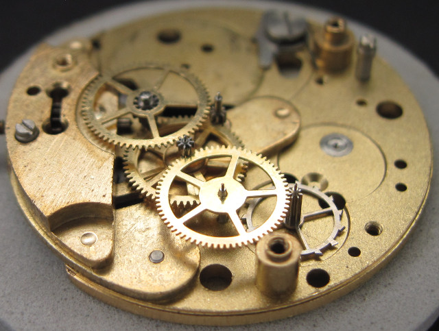 At 3 o’clock on the dial side, there’s the cannon pinion. Since it turns clockwise, the minute wheel is driven by a transmission wheel at 4 o’clock. The transmission wheel also drives the hour wheel, which also drives the date mechanism.