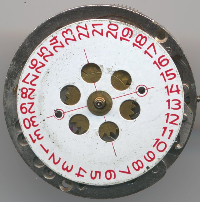 The slowly advancing date can be corrected semi-fast by turning the time back and forth a few hours. To achieve that, the driving wheel uses a spring mechanism. The date indication is realized by a disc and not by a date ring.
