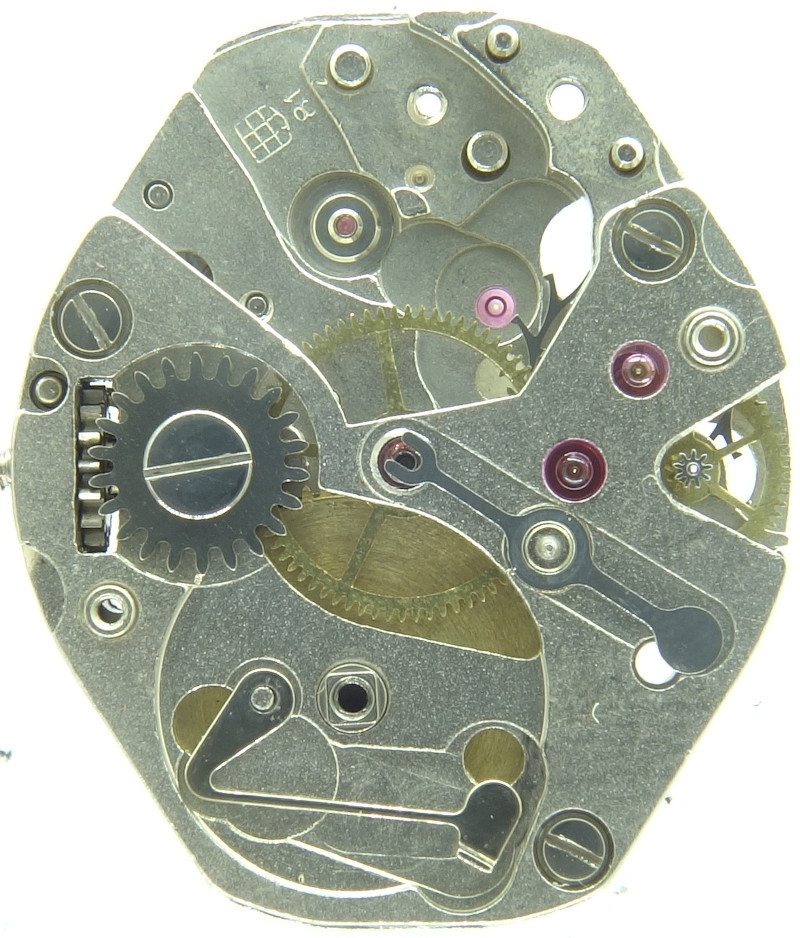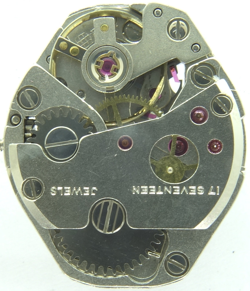 We have the expected view on the dial side, we see the woke winding system and we can see the two bearings of the third- and seconds wheel, which are above (seen from the movement side) the escape wheel.