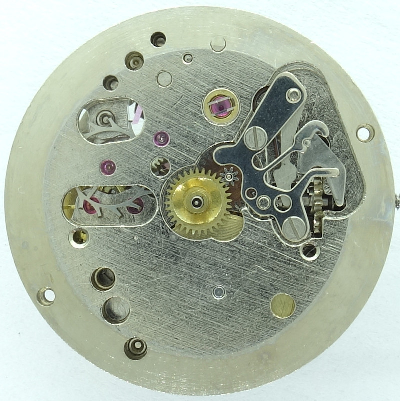 We have the expected view on the dial side, we see the woke winding system and we can see the two bearings of the third- and seconds wheel, which are above (seen from the movement side) the escape wheel.