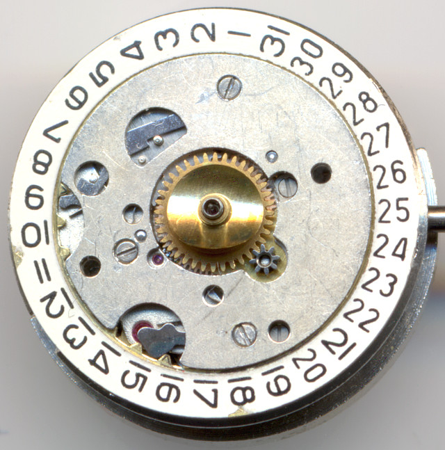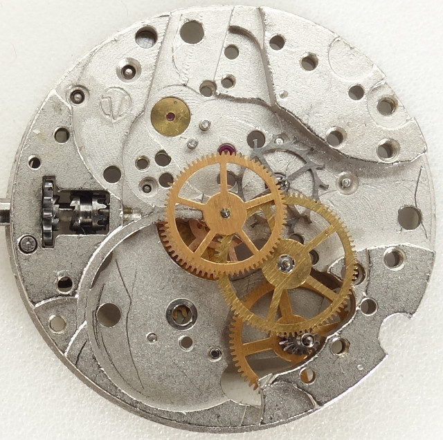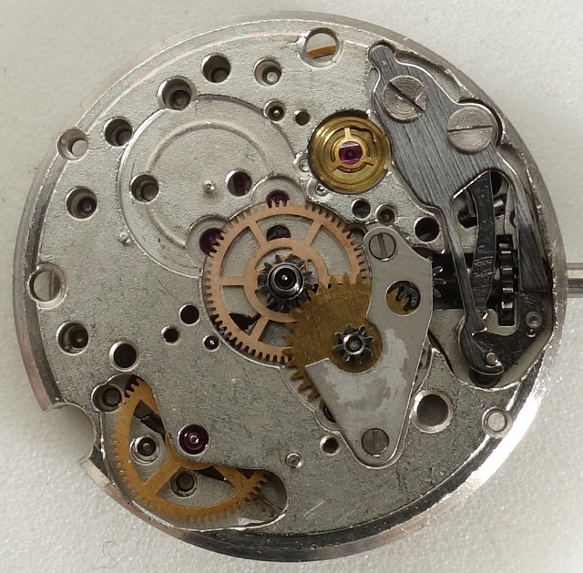 The selfwinding mechanism is implemented as a freewheel changer, so the ball-beared oscillating weight is connected to changging gears, which are equipped with a handful of flat inner discs which engage in one direction and decouple in the other direction. This principle was particularly famous for the “gyrotron” movements of Girard-Perregaux, but was also used on Russian movements such as the Vostok 2416.