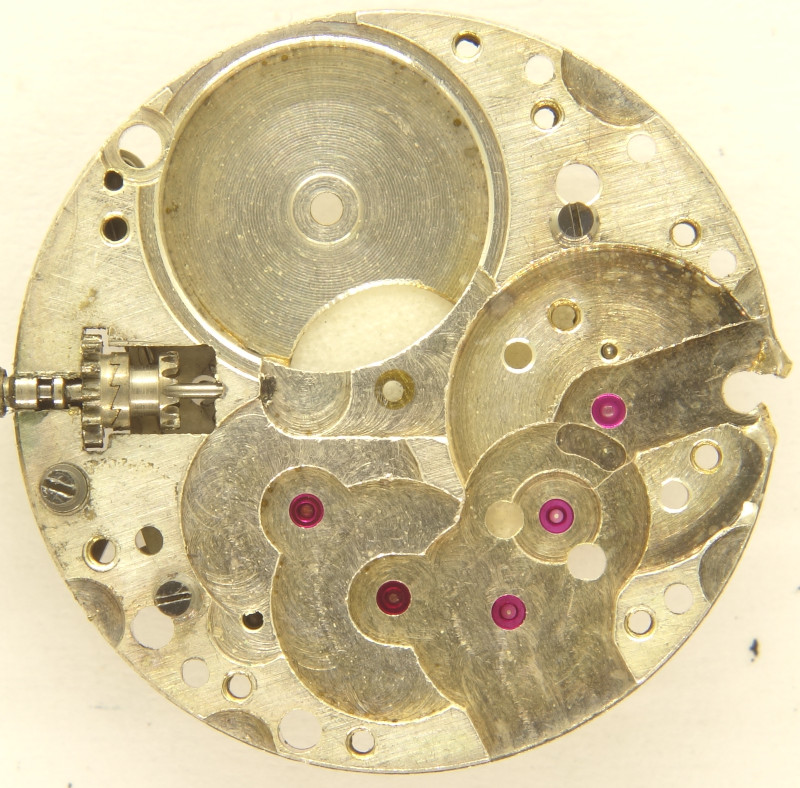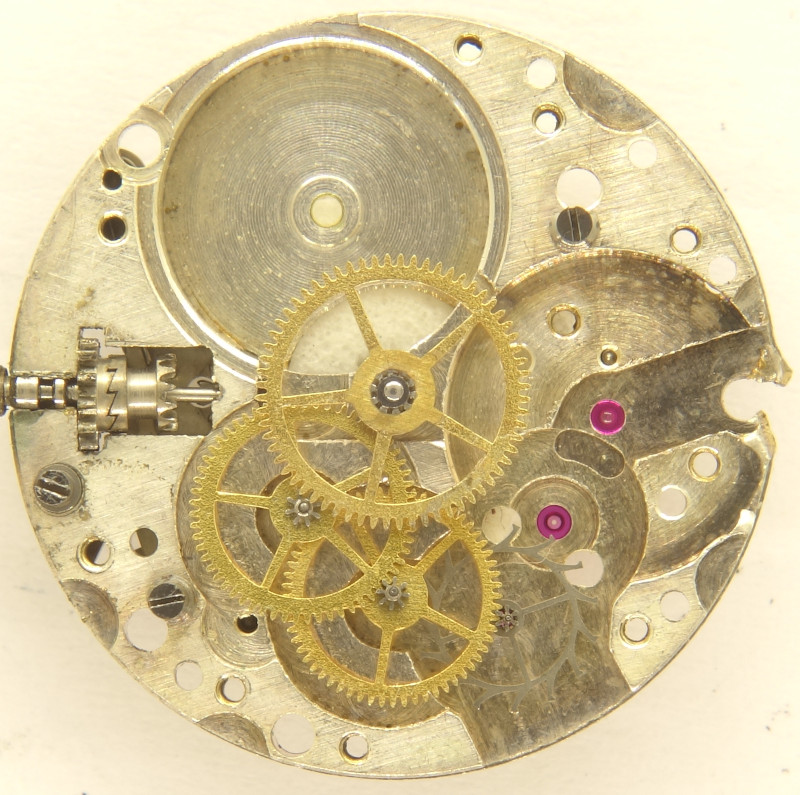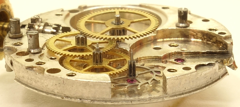 Unfortunately, the specimen shown here was treated badly from a gold butcherer, so that it is beyond repair. This is very sad, because with its specially shock protected golden-toned Glucydur screw balance, it was a very nice movement.