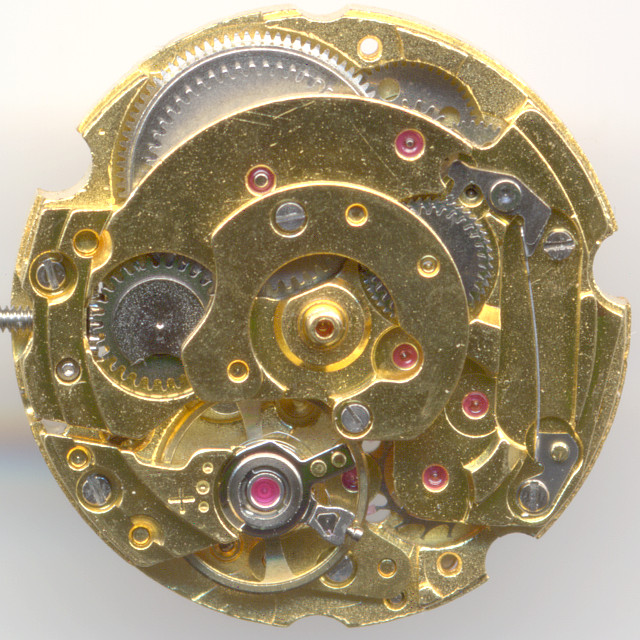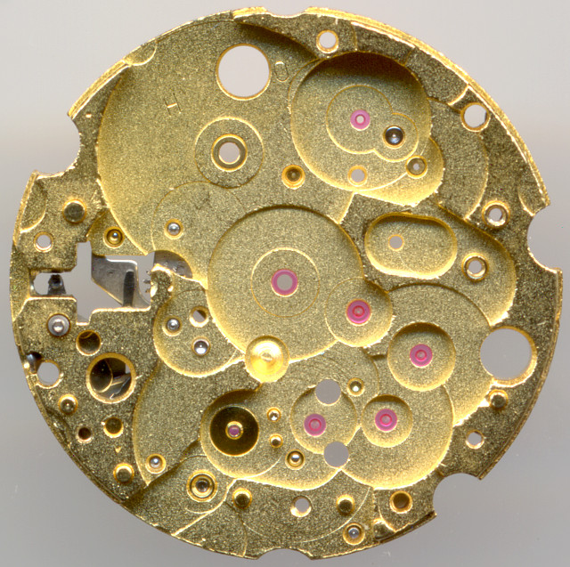 You can see on the bas plate, that this is a very well developed and reliable movement. No less than 21 bearing rubies are used here, even the center minute wheel is ruby-beared.