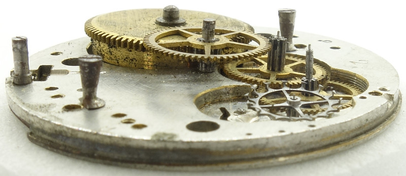 The gear train is the standard of simple cylinder movements: The mainspring barrel directly drives the center minute wheel, followed by third and forth wheel (no possibility for showing indirect seconds) and finally the individually beared cylinder wheel.