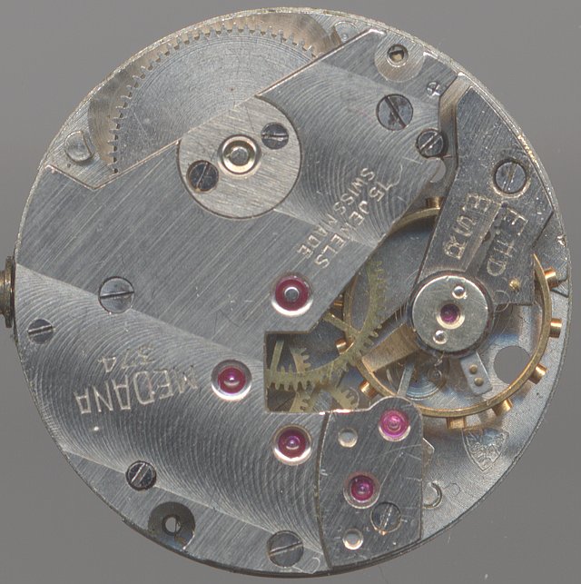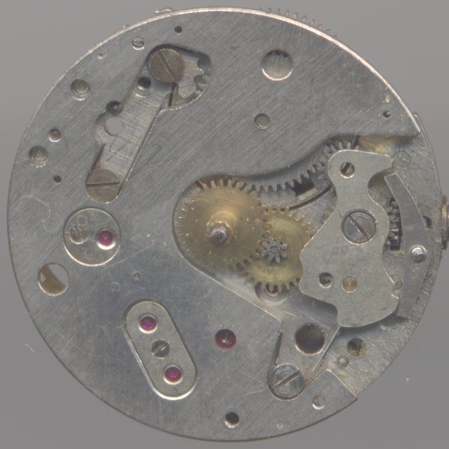 If you disregard the checp rocking bar winding mechanism on the dial, then on the plate side, you are immideatly reminded of a high quality movement because of the extensive decoration, the gold-toned “screw"balance, the twice secured mainspring bar and the complete equipment with fifteen synthetic jewels. All these are indicators for very well constructed movements.