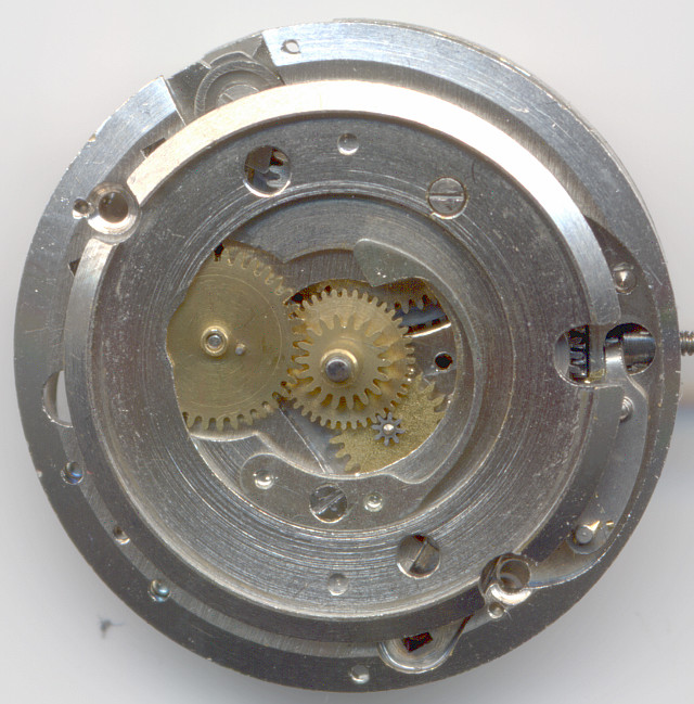 The gear train is a classic one with escapement wheel, fourth wheel (which carries a decentral second on its relative, the Osco 107), third wheel and directly driven minute wheel.