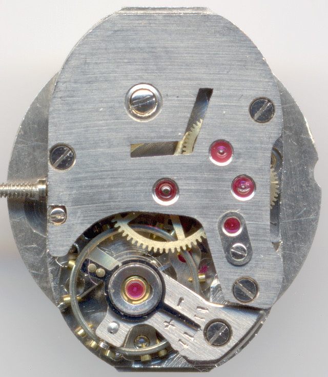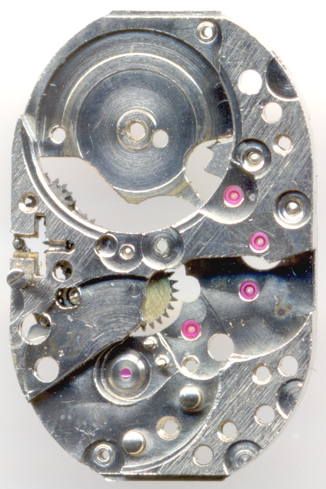 You see on the base plate, that all bearings, except those of the minute wheel, are equipped with rubies. You also see the stocky multi-storey construction, on which the bearing of the fourth wheel are above the escapement wheel.