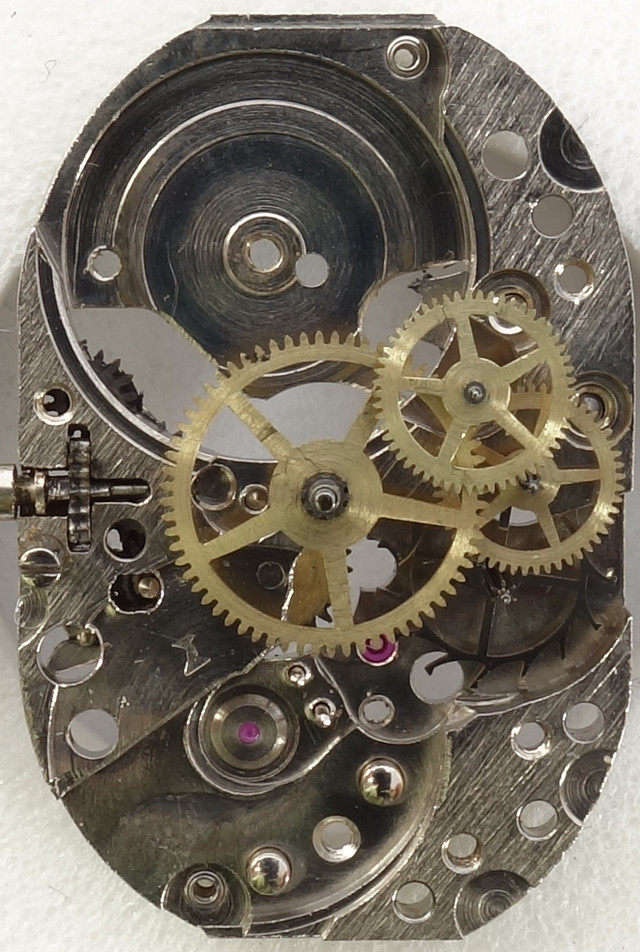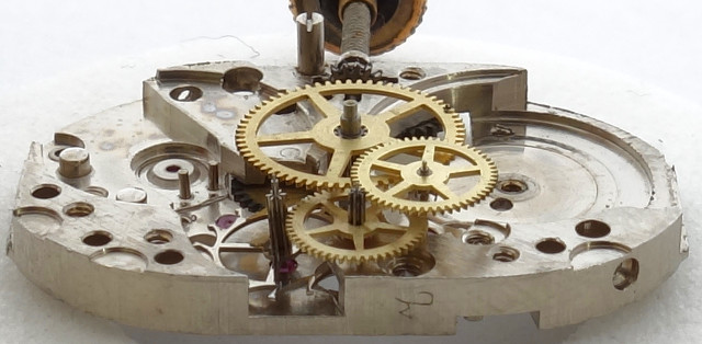 The gear train consists of a large directly driven center minute wheel, followed by two tiny wheels, the third and fourth wheel, and finally the escapement wheel. It’s hardly possible to construct an even smaller gear train.