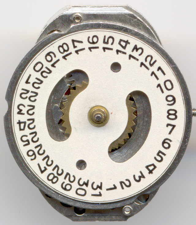 The calendar module is mounted onto the dial side of the movement with the two well visuable screws.