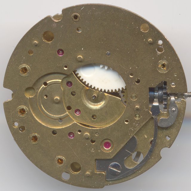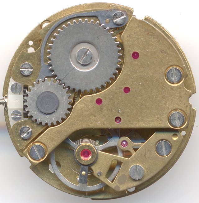 Nevertheless, all bearings of this movement use synthetic rubis, those of third and fourth weel are even covered with a cap jewel, which finally enables the manufacturer to print the “17 jewels” inscription on the dial and makes it impossible for the potential buyer to find out about the low quality inside. The second hand is by the way directly driven.